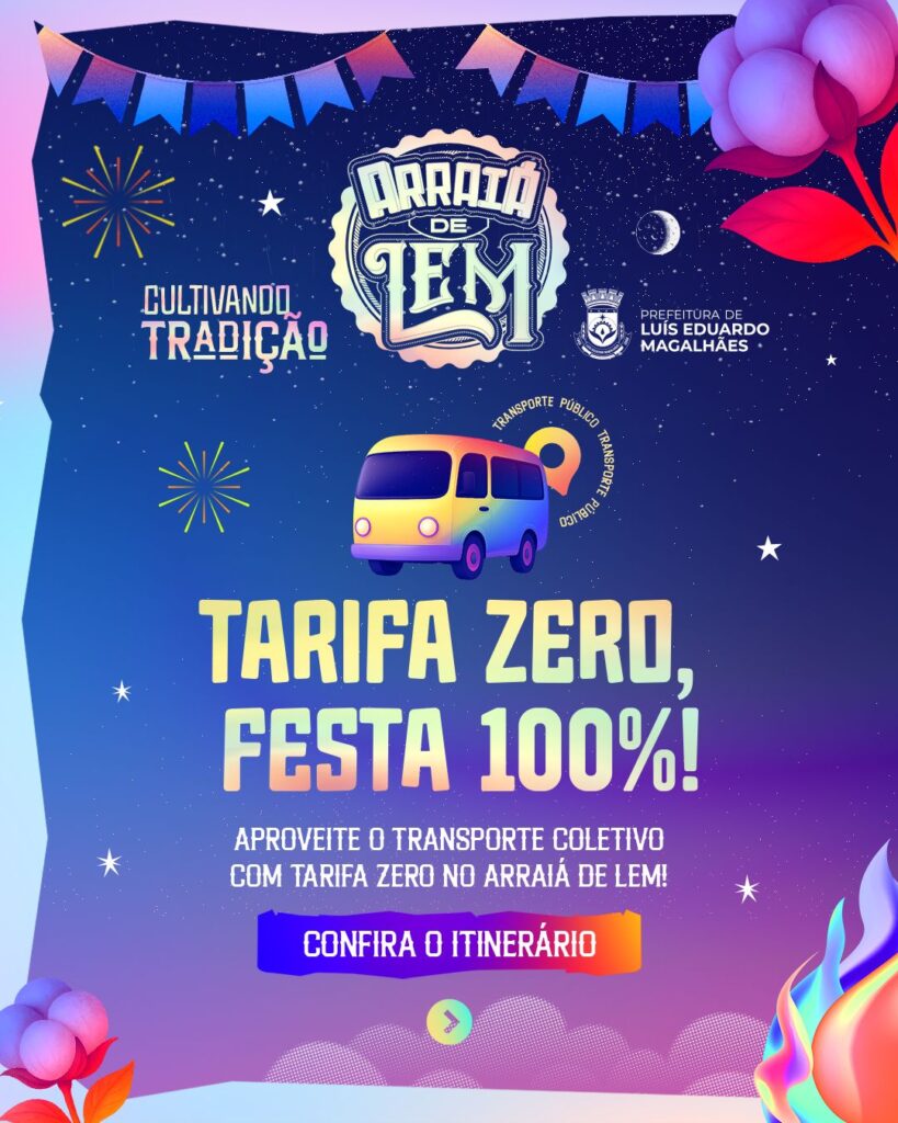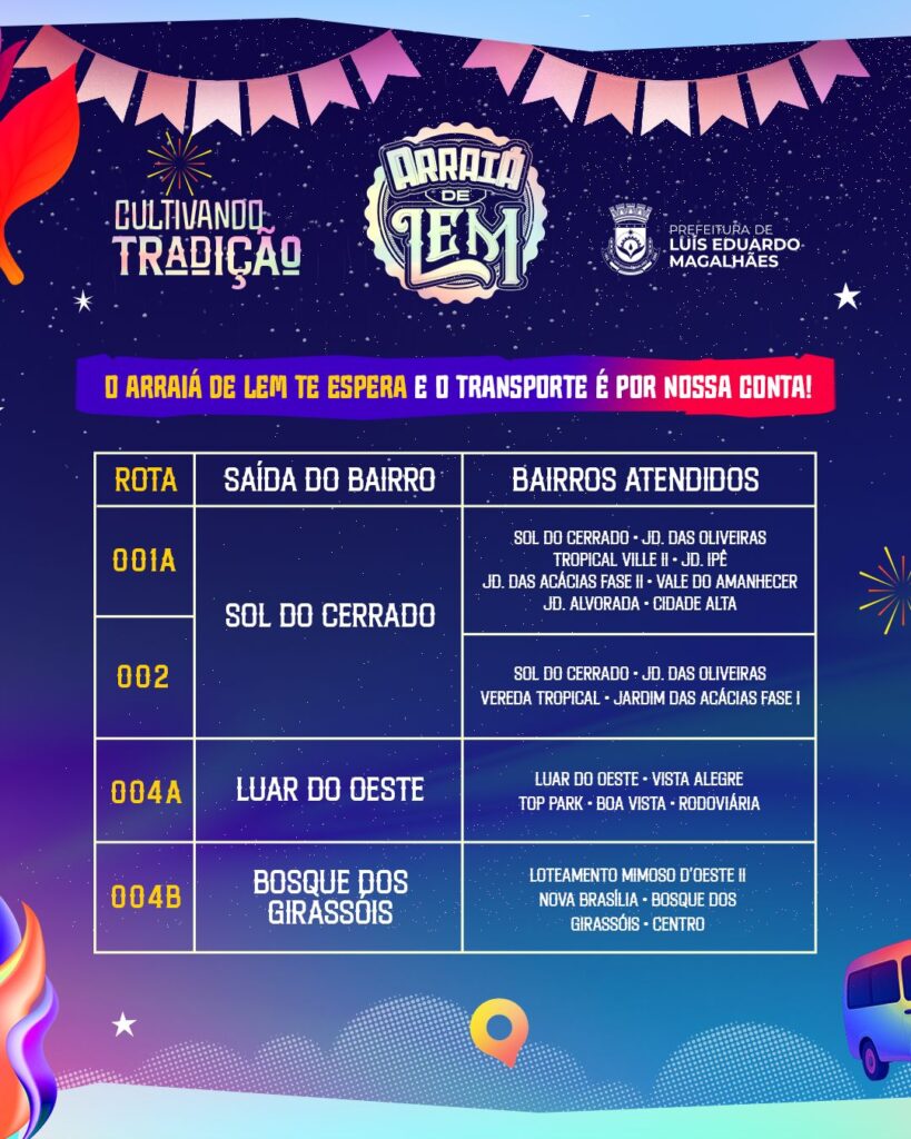 A Prefeitura de Luís Eduardo Magalhães está garantindo transporte gratuito para que os moradores de bairros mais afastados aproveitem com segurança e comodidade o Arraiá de LEM. De 27 de junho a 1º de julho, o evento contará com rotas de ônibus saindo de diferentes bairros da cidade nos dias de festa, com idas e voltas programadas durante a noite e madrugada.