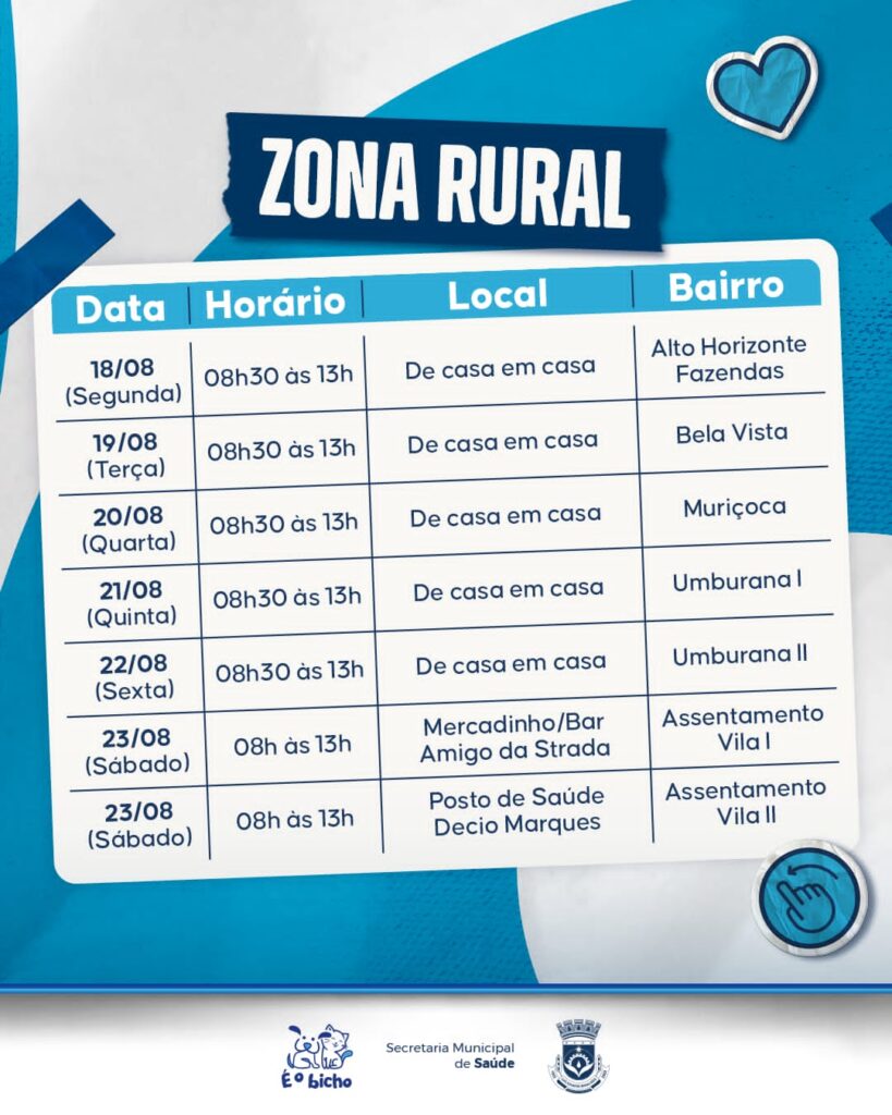 Dias 18/08 a 26/09 (quartas, quintas e sextas) – Perímetro periurbano, chácaras e demais localidades.