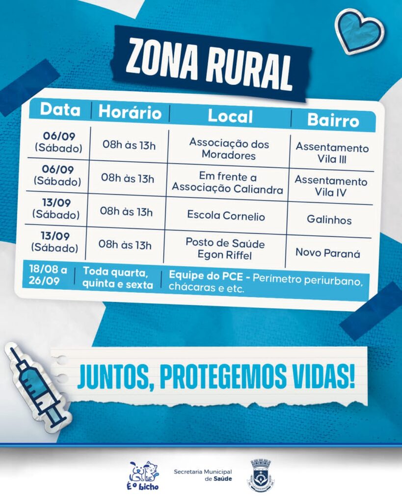 13/09 (sábado), 8h às 13h – Posto de Saúde Egon Riffel (Galinhos/Novo Paraná)