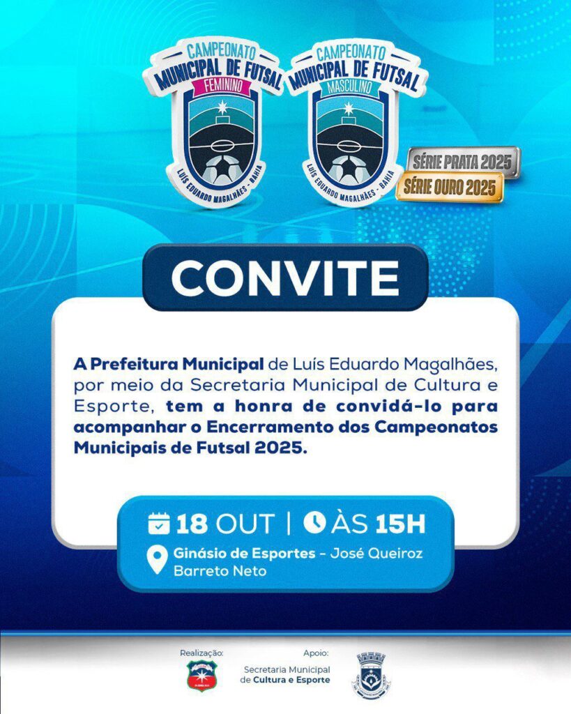 A Prefeitura de Luís Eduardo Magalhães, por meio da Secretaria Municipal de Cultura e Esportes, realiza neste sábado, 18 de outubro, a grande final do Campeonato Municipal de Futsal 2025, no Ginásio José Queiroz Barreto Neto (Ginásio da JK). O evento começa às 15h e promete reunir atletas, torcedores e famílias em uma tarde e noite de celebração esportiva.