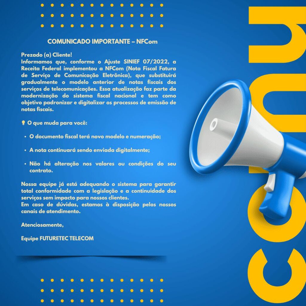 Informamos que, conforme o Ajuste SINIEF 07/2022, a Receita Federal implementou a NFCom (Nota Fiscal Fatura de Serviço de Comunicação Eletrônica), que substituirá gradualmente o modelo anterior de notas fiscais dos serviços de telecomunicações. Essa atualização faz parte da modernização do sistema fiscal nacional e tem como objetivo padronizar e digitalizar os processos de emissão de notas fiscais.
