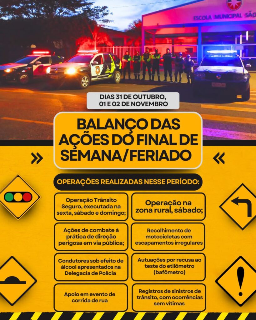A Secretaria de Segurança e Trânsito, através da SUTRANS, com apoio da GCM, informa o resumo das ocorrências registradas no último final de semana, compreendendo os dias 31 de outubro, 1º e 2 de novembro.