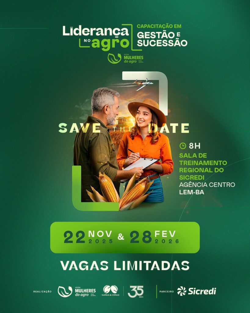 O Núcleo Mulheres do Agro do Oeste da Bahia, em parceria com a Safras & Cifras e com o apoio do Sicredi e da Associação de Agricultores e Irrigantes da Bahia (Aiba), realiza no dia 22 de novembro, no auditório da AIBA, em Luís Eduardo Magalhães, o I Módulo do Workshop Liderança do Agro: Capacitação em Gestão e Sucessão. O encontro reúne produtores, sucessores, lideranças e profissionais do agronegócio para discutir gestão, inovação e os novos desafios do setor.
