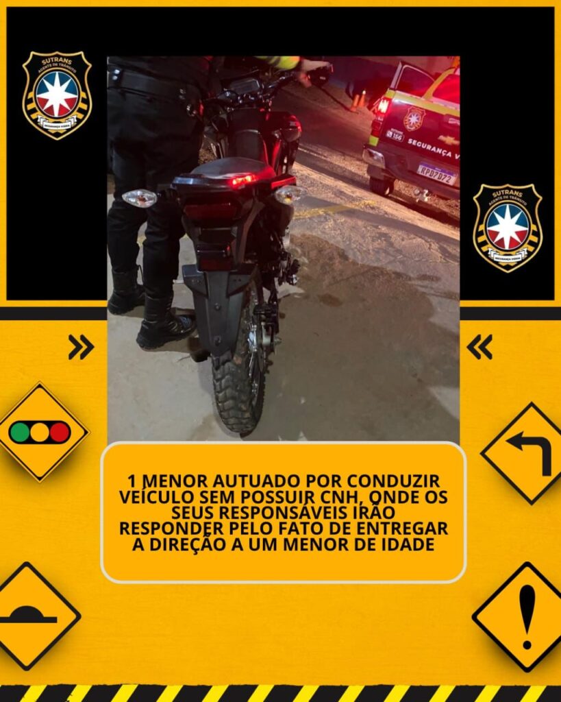 • 1 menor autuado por conduzir veículo sem possuir CNH,onde os seus responsáveis irão responder pelo fato de entregar a direção a um menor de idade