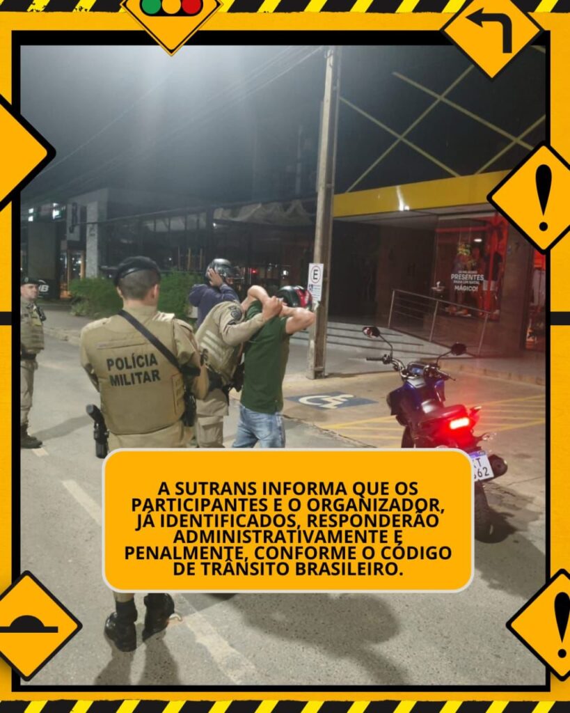 A SUTRANS informa que os participantes e o organizador, já identificados, responderão administrativamente e penalmente, conforme o Código de Trânsito Brasileiro. As multas podem variar de R$ 2.934 a R$ 17.000, e os veículos permanecerão retidos até o término do recesso público municipal, sendo liberados somente após a regularização de todas as irregularidades.