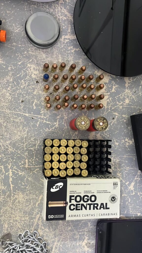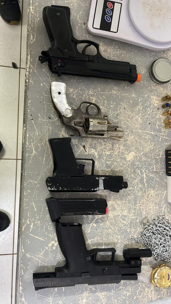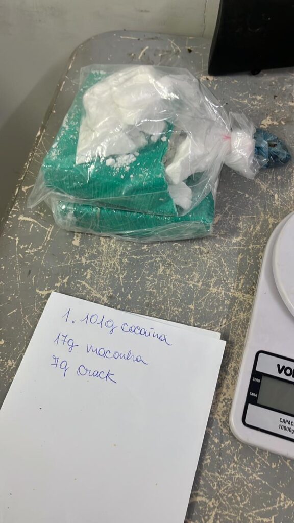 No local após procedimentos de abordagem, os policiais militares encontraram 01 quilo e 100 gramas de cocaína, porções de maconha e crack, 01 balança de precisão, 01 pistola calibre 9 mm, 01 simulacro de arma de fogo tipo pistola, 01 arma de fabricação artesanal, 01 revólver calibre 38, 33 munições calibre .380, 30 munições calibre 38, 02 munições calibre 12, 01 espingarda de pressão e 04 celulares sem procedência comprovada.