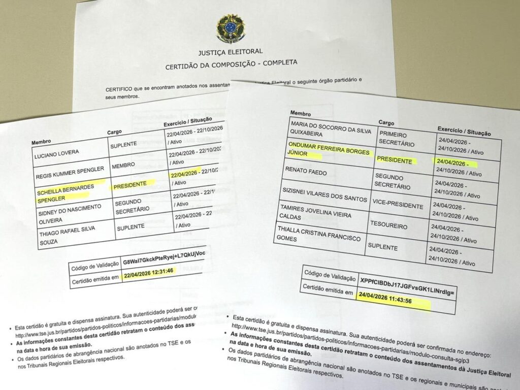 A Certidão da Composição Partidária que a identificava como presidente, foi emitida no dia 22/04/2026 às 12h31. No dia 24/04/2026 às 11h43 uma nova Certidão foi emitida pela Justiça Eleitoral devolvendo o comando do Partido aos antigos membros, pondo um fim à tentativa de ‘traição partidária’ orquestrado pelo grupo que compõe a Rádio Cultura FM, sob o comando de Diogo Spengler. Scheilla tomou a sua segunda bola nas costas.