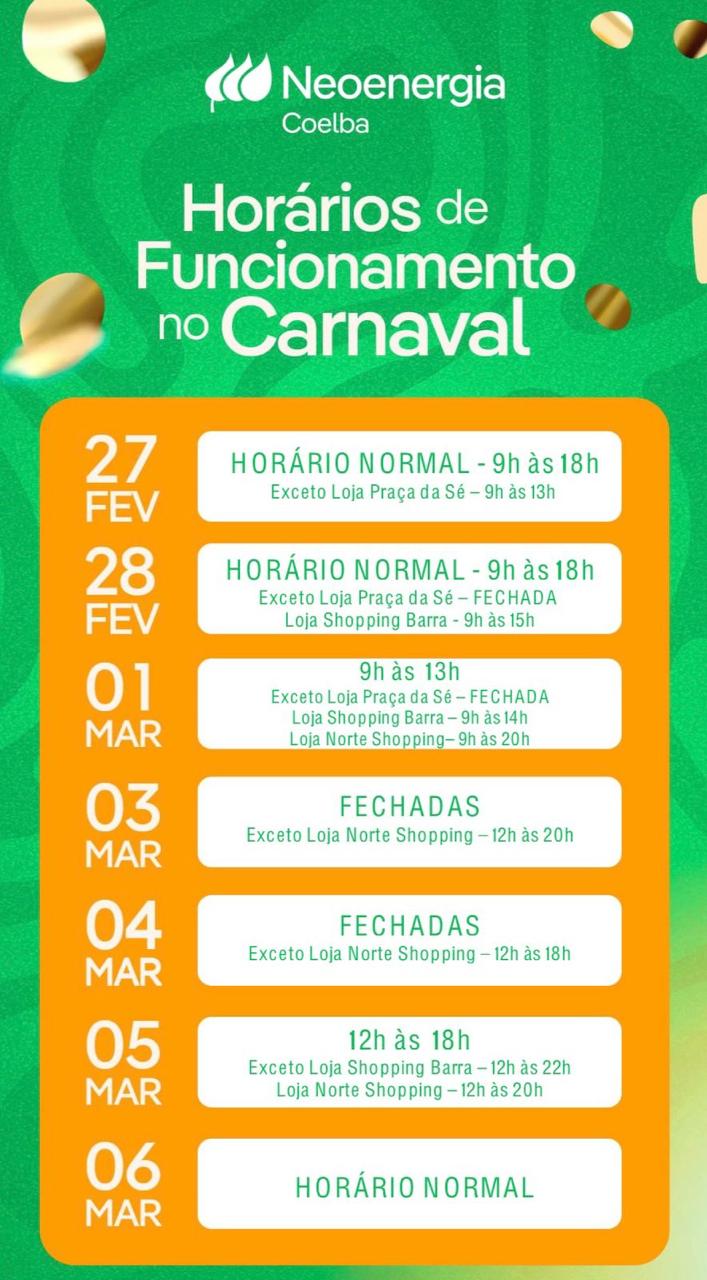Lojas de atendimento da Neoenergia Coelba funcionarão em horário especial durante o Carnaval; confira Os clientes da Neoenergia Coelba que...