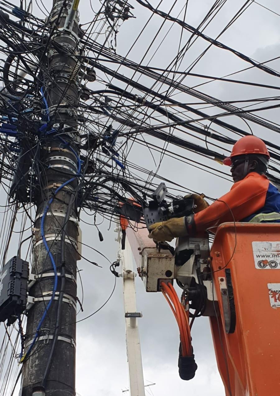 Mais de três toneladas de cabos irregulares de telefonia e internet são removidas dos postes na Av. Tancredo Neves, em...